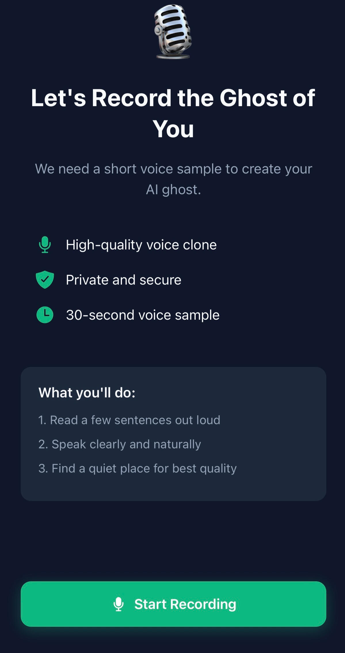 Delete your voice clone whenever you want, and your Ghost will be permanently removed. We do not retain your data after deletion.